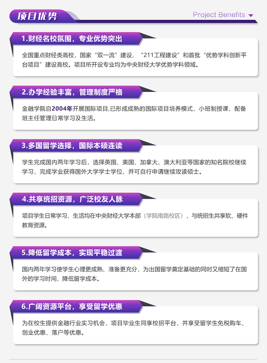 中央财经大学始建于1949年,是教育部直属、国家“双一流”建设、“211工程”建设和首批“985优势学科创新平台”项目建设高校。 中央财经大学金融学科于2001年被教育部评定为国家级重点学科,2007年再次获聘国家重点学科并支撑中央财经大学应用经济学科成为国家重点一级学科,2017年应用经济学被确定为国家双一流学科。 着经济全球化浪潮的快速推进,学校实施国际化战略,大力开展多形式、错层次的国际交流与合作,已与遍及世界五大洲的高校、政府机构、国际组织、跨国企业等190余家单位建立了密切的合作关系。 2017年,中国(教育部)留学服务中心与中央财经大学签署协议建立战略合作关系,开展金融学院国际本科项目。