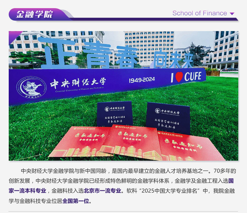 中央财经大学始建于1949年,是教育部直属、国家“双一流”建设、“211工程”建设和首批“985优势学科创新平台”项目建设高校。 中央财经大学金融学科于2001年被教育部评定为国家级重点学科,2007年再次获聘国家重点学科并支撑中央财经大学应用经济学科成为国家重点一级学科,2017年应用经济学被确定为国家双一流学科。 着经济全球化浪潮的快速推进,学校实施国际化战略,大力开展多形式、错层次的国际交流与合作,已与遍及世界五大洲的高校、政府机构、国际组织、跨国企业等190余家单位建立了密切的合作关系。 2017年,中国(教育部)留学服务中心与中央财经大学签署协议建立战略合作关系,开展金融学院国际本科项目。