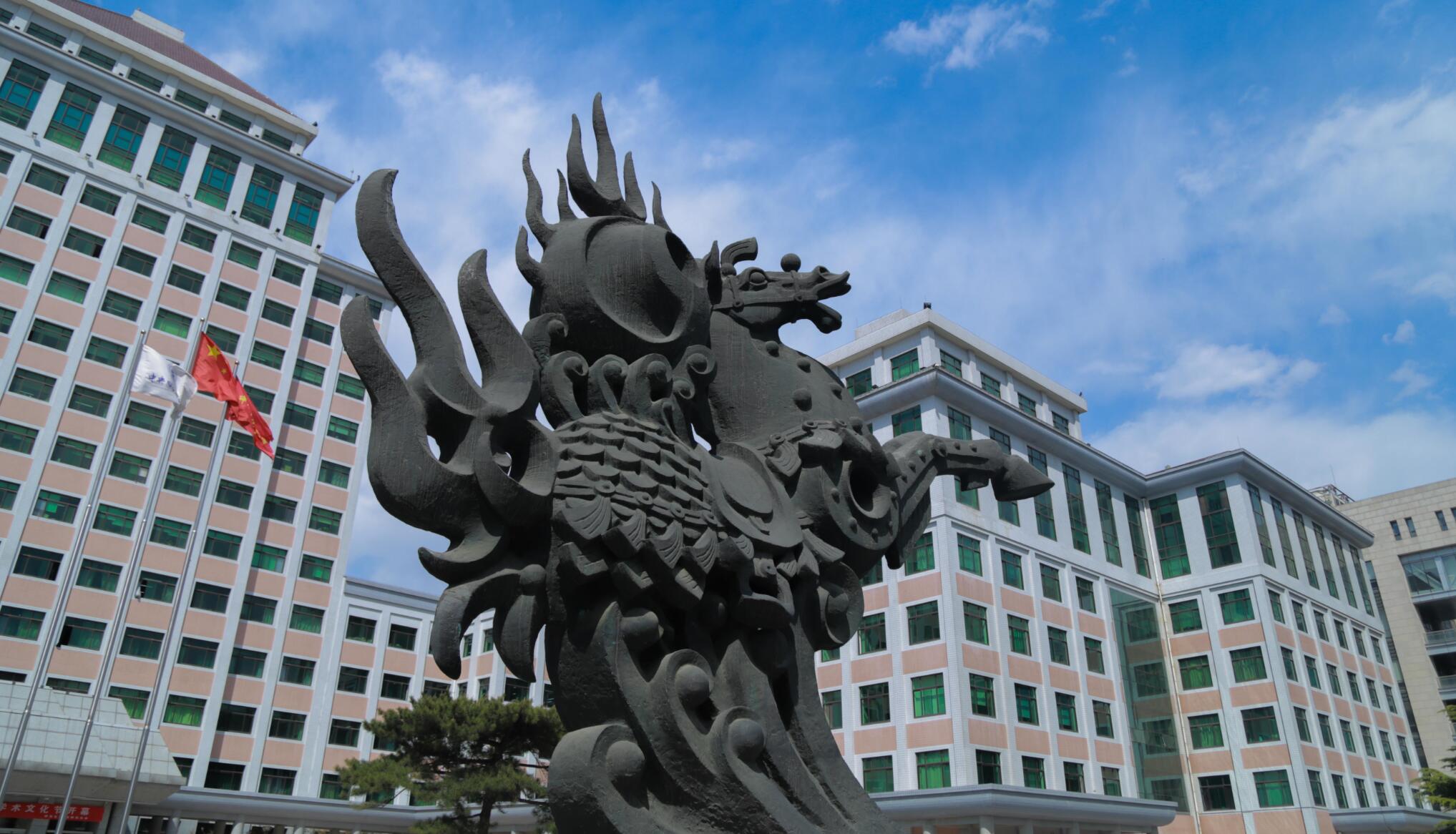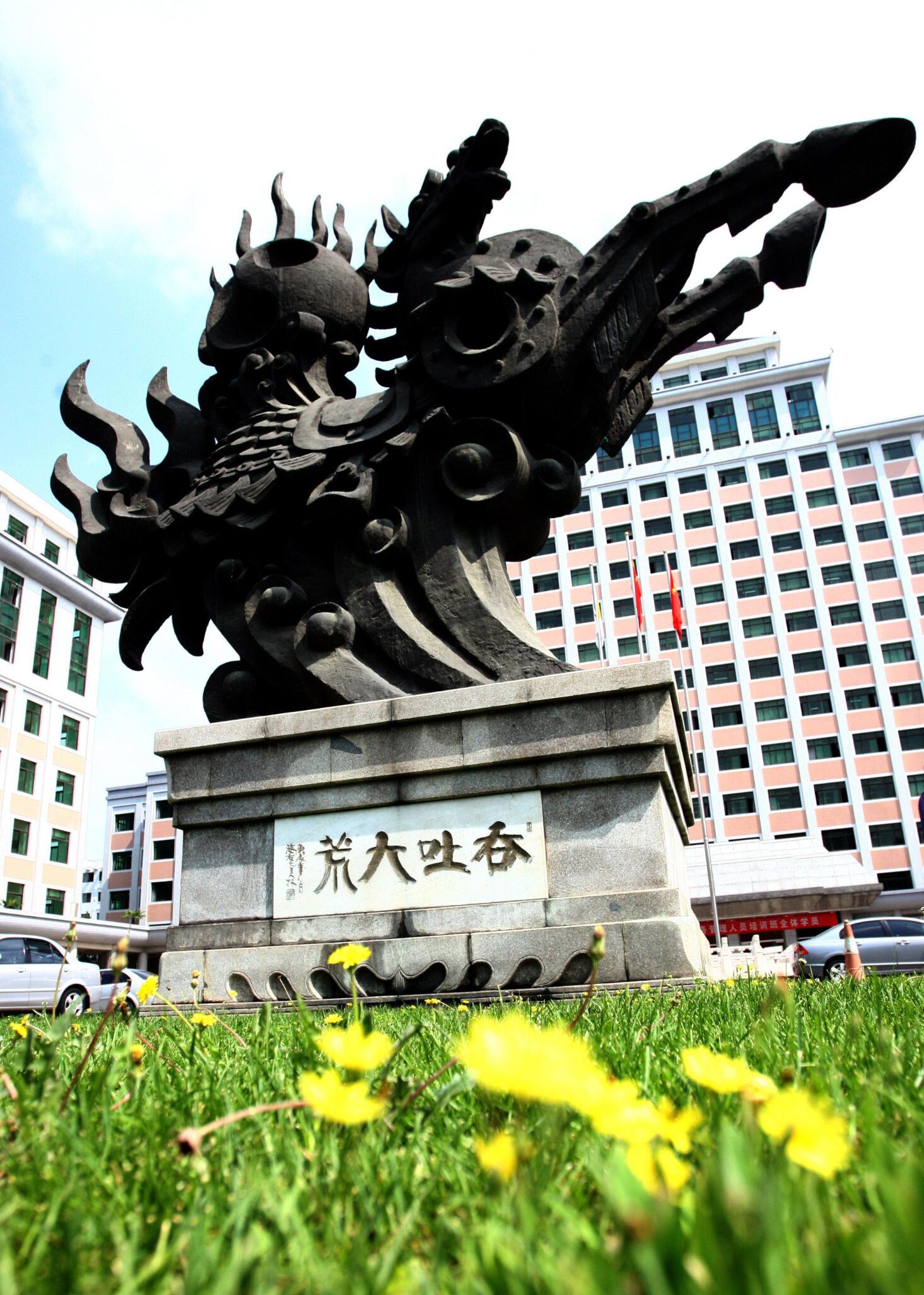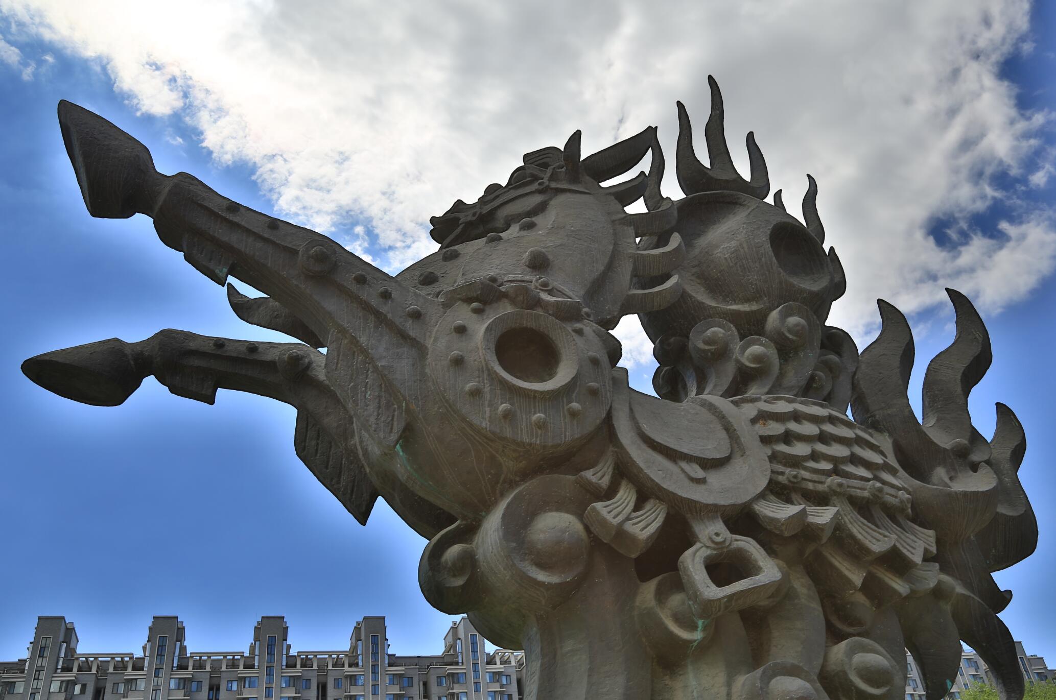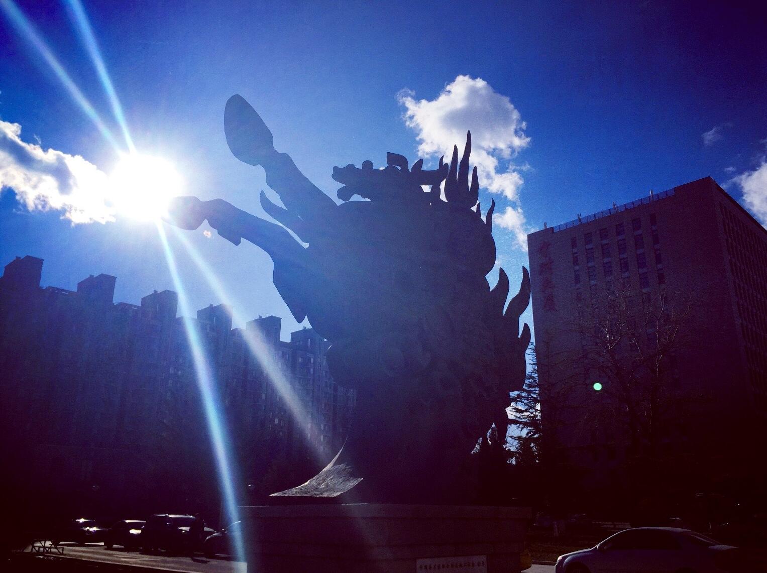 雕塑造型由龙马和象征乾坤的太极球组成,用青铜铸就,通高9米,称之为“龙马担乾坤”。按照中国传统说法,所谓“龙马精神”即“龙”与“马”有着共同的灵魂,马亦是龙。龙马担乾坤,体现了中华民族顶天立地的气派。